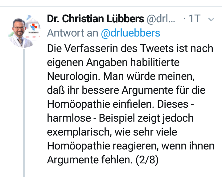 Die Verfasserin des Tweets ist nach eigenen Angaben habilitierte Neurologin. Man würde meinen, daß ihr bessere Argumente für die Homöopathie einfielen. Dieses - harmlose - Beispiel zeigt jedoch exemplarisch, wie sehr viele Homöopathie reagieren, wenn ihnen Argumente fehlen. (2/8)