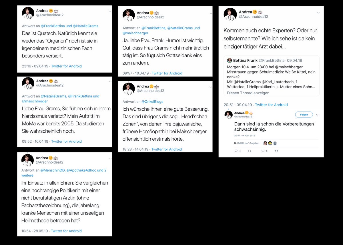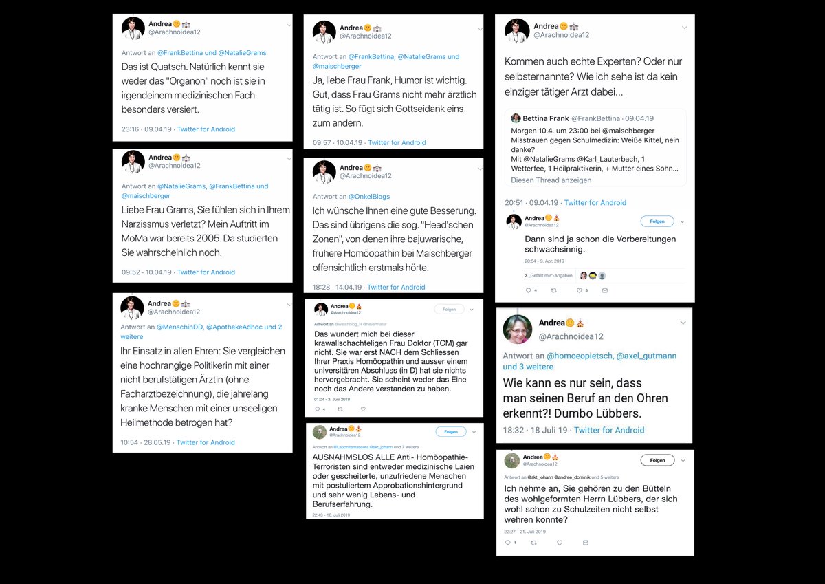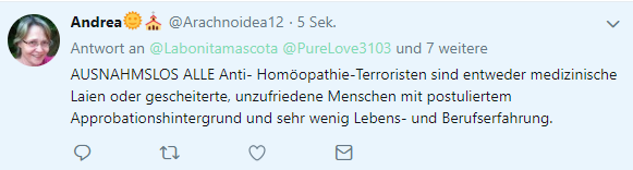 "Frage: Wer steckt hinter der hoch aggressiven Anti-#Homöopathie-Kampagne? Auf meine 2 vorsichtig toleranten Tweets kamen so entwertende Antworten, dass ich mehrere Accounts blocken musste...."