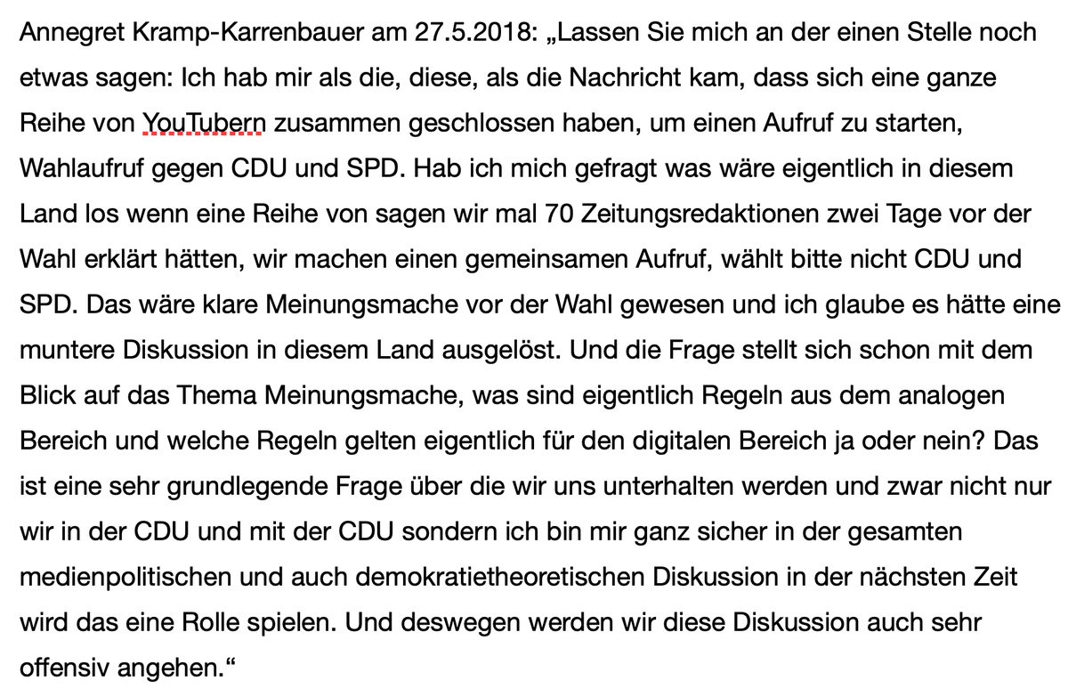 "Lassen Sie mich an der einen Stelle noch etwas sagen: Ich hab mir als die, diese, als die Nachricht kam, daß sich eine ganze Reihe von YouTubern zusammengeschlossen haben um einen Aufruf zu starten, Wahlaufruf gegen CDU und SPD, hab ich mich gefragt, was wäre eigentlich in diesem Land los, wenn eine Reihe von - sagen wir mal - 70 Zeitungsredaktionen 2 Tage vor der Wahl erklärt hätten: "Wir machen einen gemeinsamen Aufruf: Wählt bitte nicht CDU und SPD:" Das wäre klare Meinungsmache vor der Wahl gewesen und ich glaube, es hätte ne muntere Diskussion in diesem Land ausgelöst. Und die Frage stellt sich schon mit dem Blick auf das Thema Meinungsmache: "Was sind eigentlich Regeln aus dem analogen Bereich und welche Regeln gelten eigentlich für den digitalen Bereich, ja oder nein?" Das ist eine sehr grundlegende Frage, über die wir uns unterhalten werden, und zwar nicht nur wir in der CDU und mit der CDU, sondern, ich bin mir sicher, in der der gesamten medienpolitischen und auch demokratietheoretischen Diskussion in der nächsten Zeit wird das eine Rolle spielen. Und deswegen werden wir diese Diskussion auch sehr offensiv angehen."