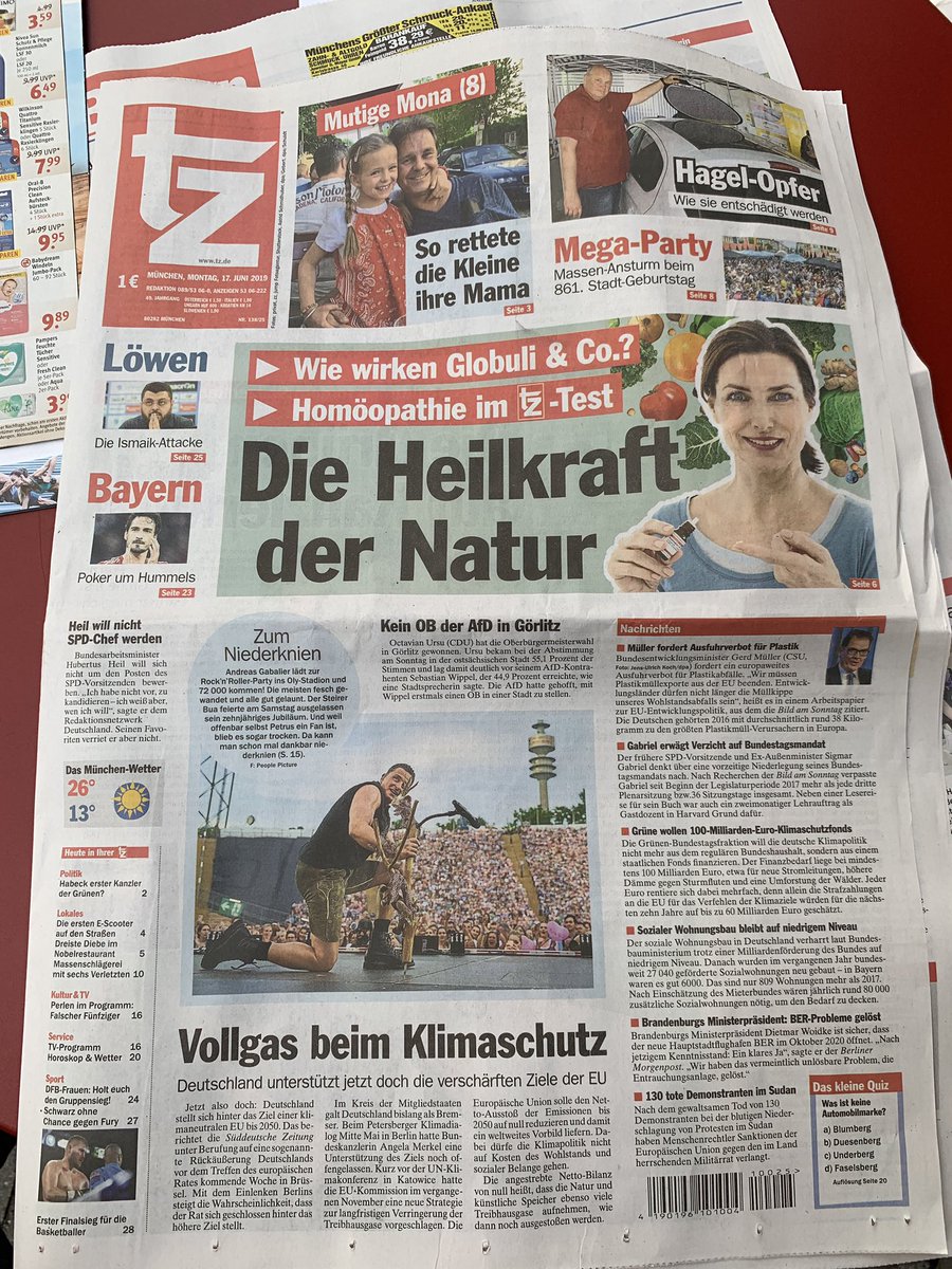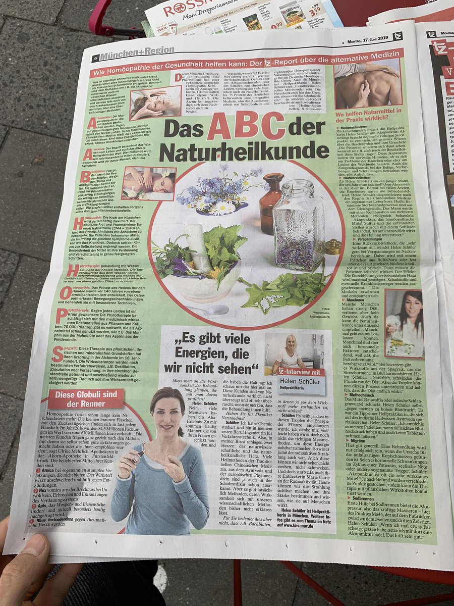 Stefan Schwarz hat ein Exemplar der Münchener Tageszeitung tz (eine erbärmliche Yellowpress-Ruine mit ekelhaftem Clickbait) gefunden mit einer ganzseitigen Reklame für Homöopathie, und dazu noch eine große Ankündigung auf der Titelseite: