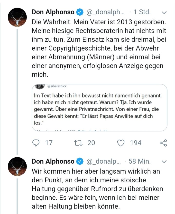 Ich habe geschrieben: Don Alphonso droht Frauen mit Anklage, und da er reich ist und Zugang zu guten Jurist*innen hat, trauen sie sich nicht, öffentlich darüber zu sprechen.