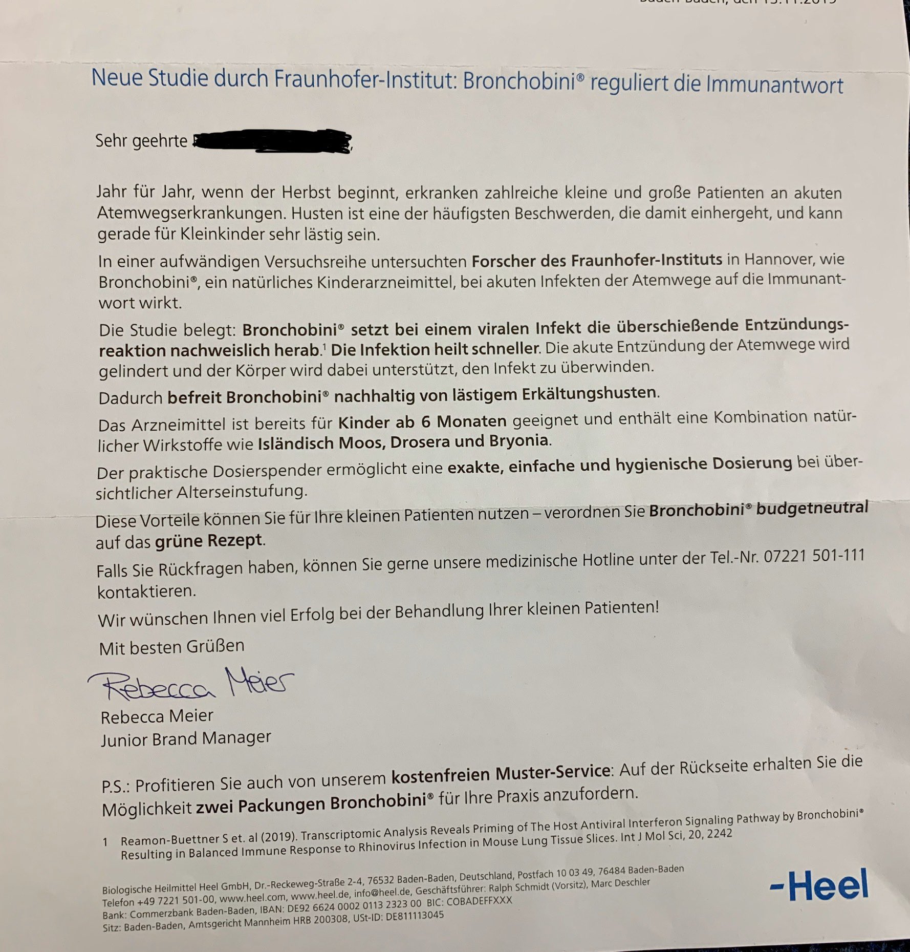 Heel verwendet die Studie als Reklamevehikel. Die Existenz der Studie ist für Heel wichtig. In dem Brief sind mehrere Stellen markiert.