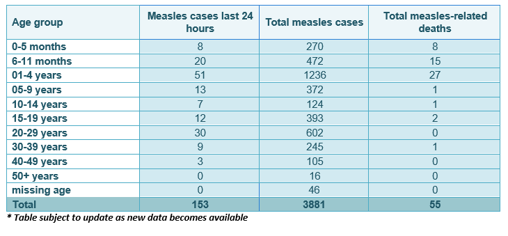 Latest update: 3,881 measles cases have been reported since the outbreak with 153 recorded in the last 24 hours. To date, 55 measles related deaths have been recorded.