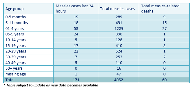 Latest update: 4,052 measles cases have been reported since the outbreak with 171 recorded in the last 24 hours. To date, 60 measles related deaths have been recorded.