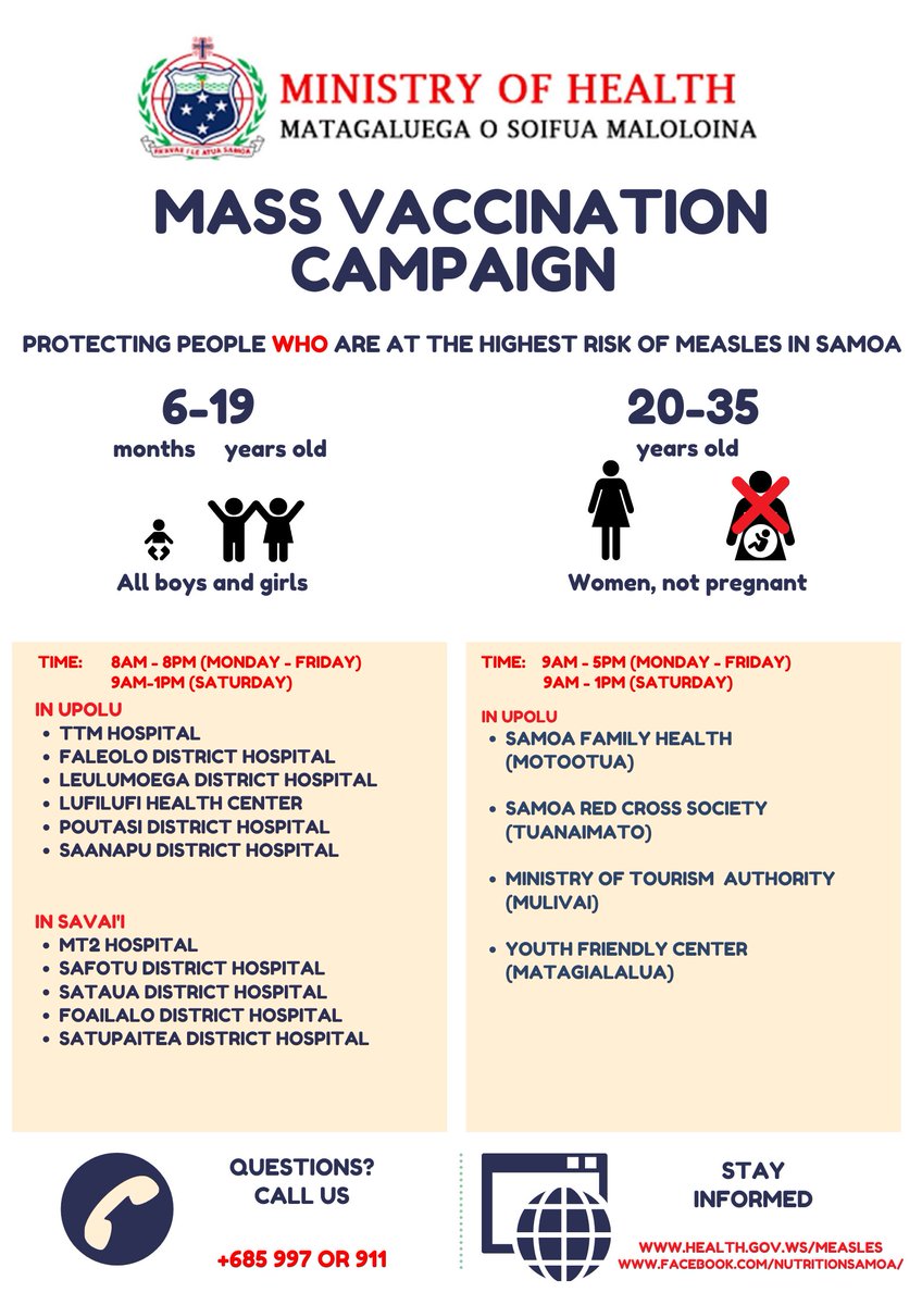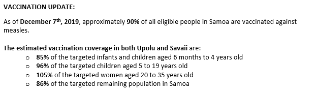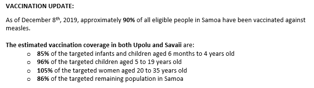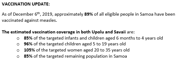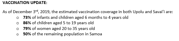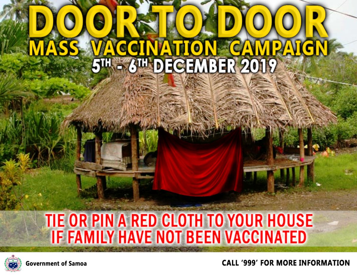 In response to the current measles outbreak, the @samoagovt will be undertaking a ‘Door to door Mass Vaccination Campaign’ on Thursday 5th and Friday 6th December, 2019 from 7am to 5pm throughout the whole country.