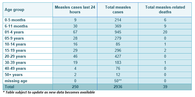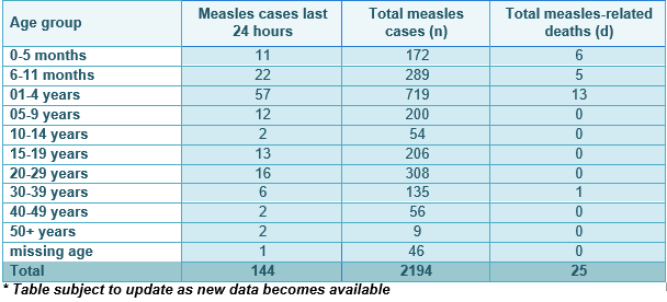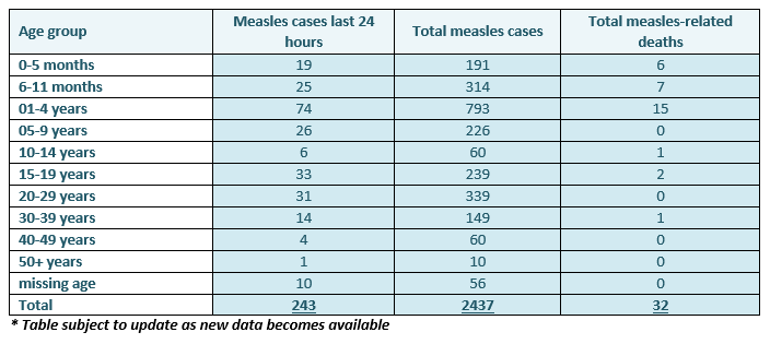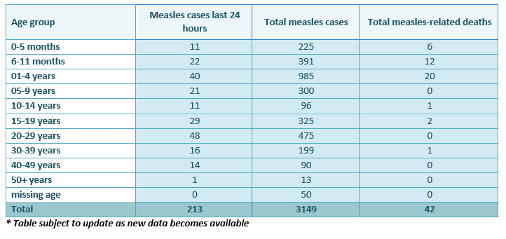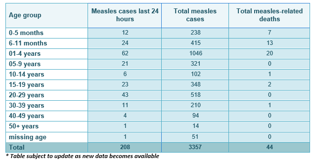 Latest update: 4,217 measles cases have been reported since the outbreak with 165 recorded in the last 24 hours. To date, 62 measles related deaths have been recorded.