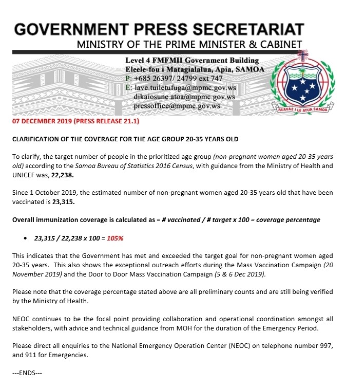 Clarification on collection of above data and full press conference at: https://facebook.com/samoagovt/