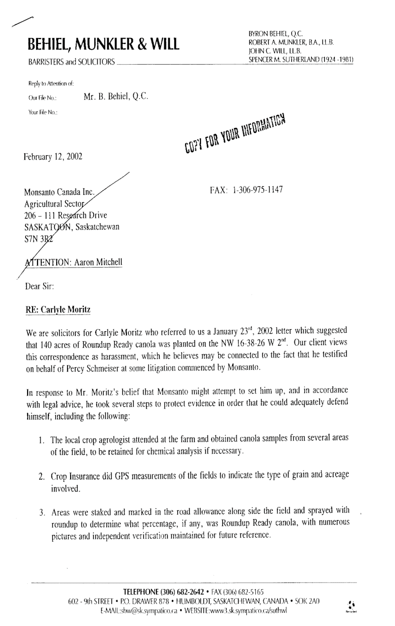 Then in January 2002, Moritz received the following letter from Aaron Mitchell of Monsanto. Mitchell is the Intellectual Property Protection Manager for Monsanto and has been the point person for Monsanto's activities in protecting the use of Round-Up Ready canola.