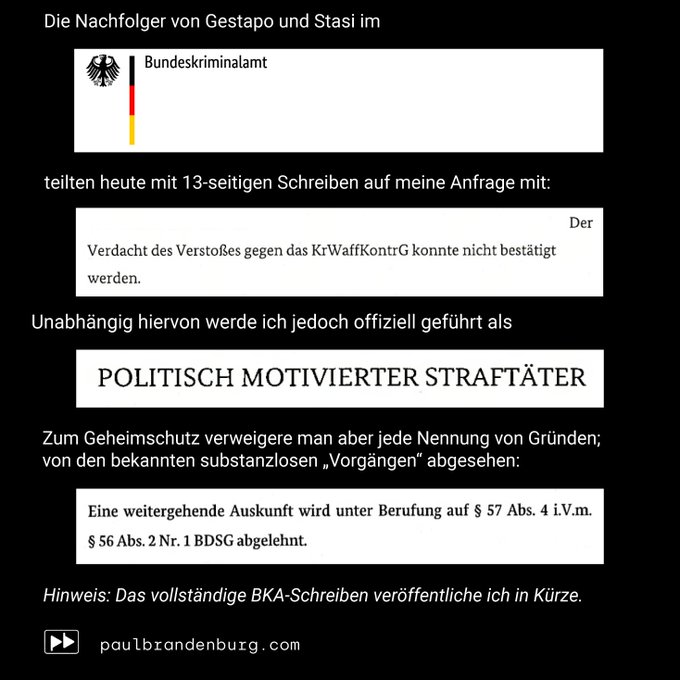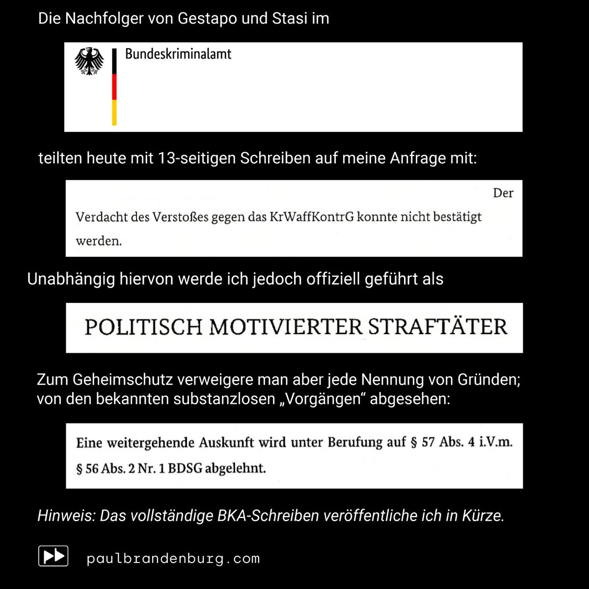 Die Nachfolger von #Gestapo und #Stasi beim @bka teilten mir heute mit, mit, ich sei ein "POLITISCH MOTIVIERTER STRAFTÄTER". Begründung: Geheim.