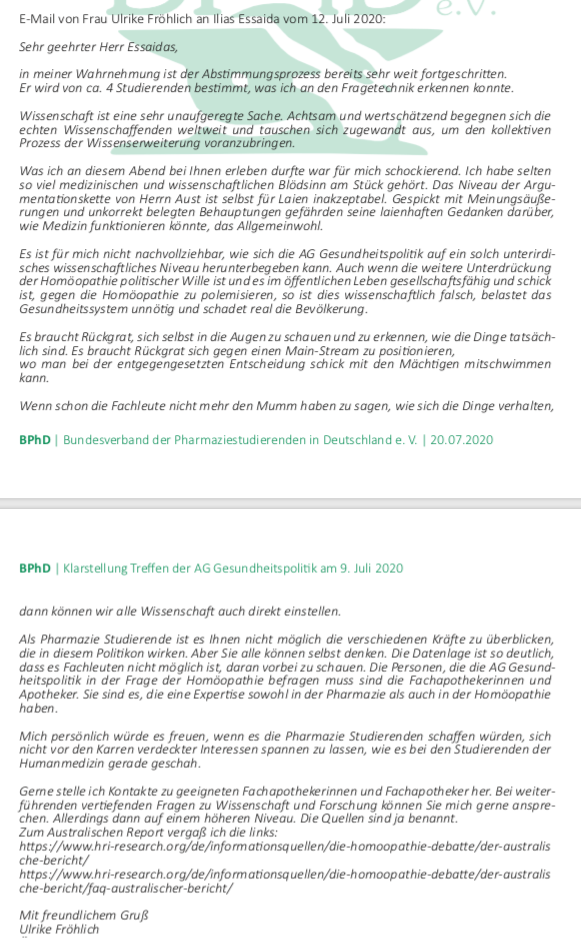 „Gerne habe ich Sie alle nach dem Wissenschafts- Kodex informiert. Als Pharmazie Studierende sollte dies der Mindeststandard solch einer Veranstaltung sein.“ Weiter zitierte sie die „Leitlinien zur Sicherung guter wissenschaftlicher Praxis“ der Deutschen Forschungsgemeinschaft (DFG): „Wissenschaftlerinnen und Wissenschaftler aller Karriereebenen aktualisieren regelmäßig ihren Wissenstand zu den Standards guter wissenschaftlicher Praxis und zum Stand der Forschung.“ In einer weiteren E-Mail vom 12. Juli, welche Ihnen im Anhang zur Verfügung steht, warf Frau Fröhlich sowohl der AG, als auch dem Dr. Aust Niveaulosigkeit vor. Des Weiteren bezichtigte sie die Studierenden der Humanmedizin, sich bei der Positionierung zum Thema Homöopathie “vor den Karren verdeckter Interessen” spannen gelassen zu haben.