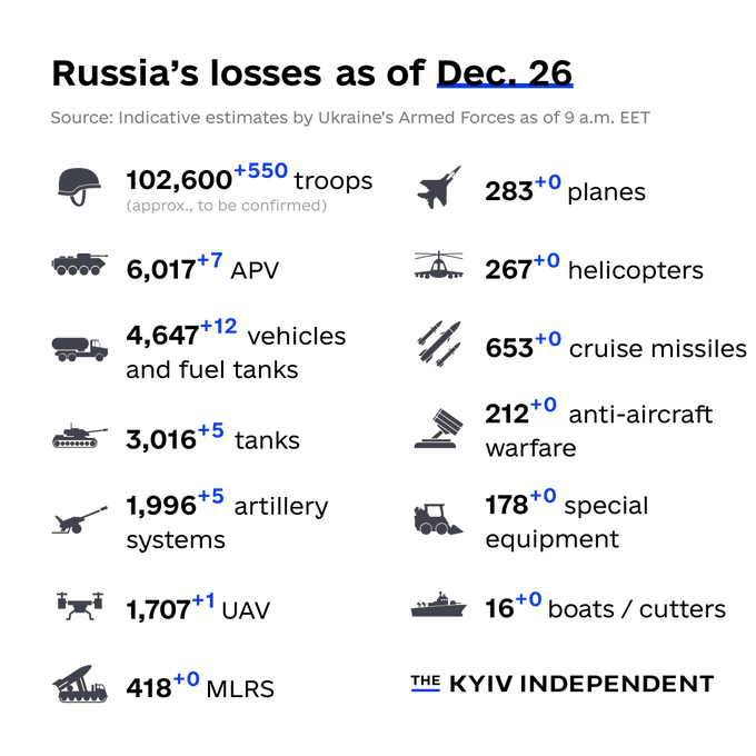 Stand 26.12.2022: Rußland hat noch 284 Panzer.