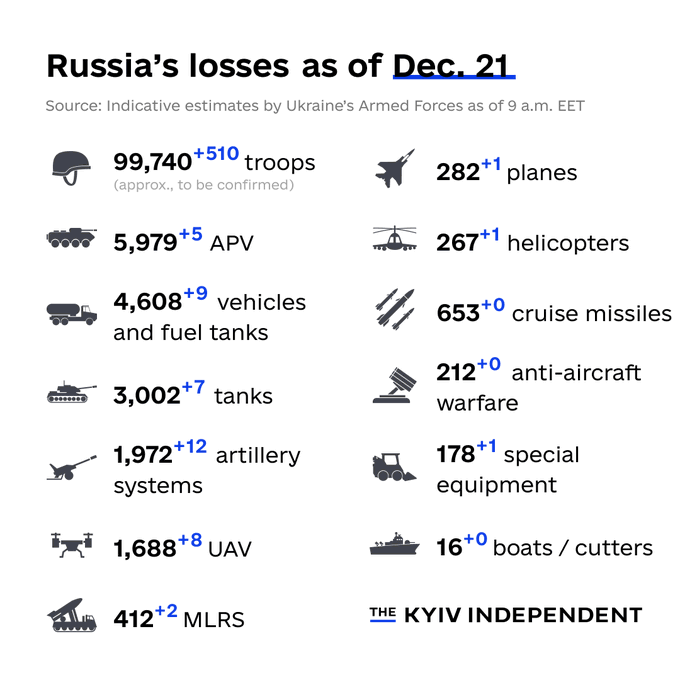 Stand 21.12.2022: Rußland hat noch 298 Panzer.