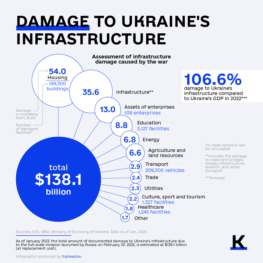 The Ministry of Economy of Ukraine and the Kyiv School of Economics report estimates that Russia's full-scale invasion caused over $138 billion worth of damages. The full-scale war affected a wide range of sectors, with housing and infrastructure witnessing the heaviest toll.