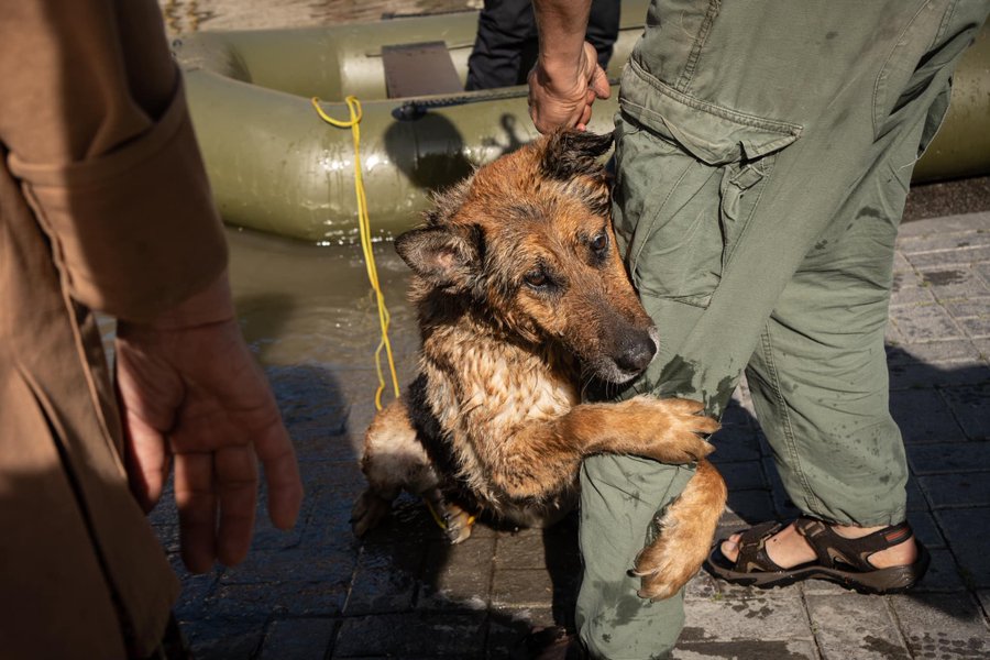 Rescuers assisting with evacuations in Kherson saved a dog that was drowning in flood waters.