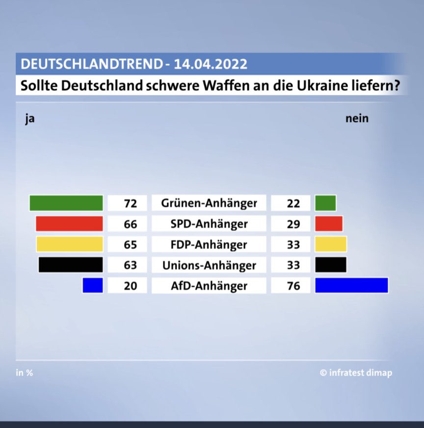 Daß rund 3/4 der Grünen-Anhänger für Waffenlieferungen an die Ukraine sind, ist beachtlich. Ich hätte nie gedacht, daß die jemals ihren Hintern hoch kriegen, wenn es mal ernst wird.