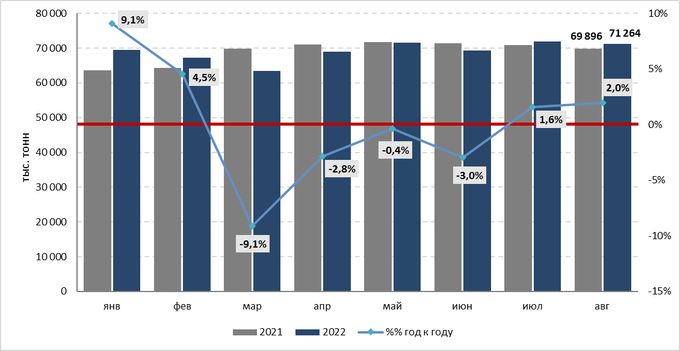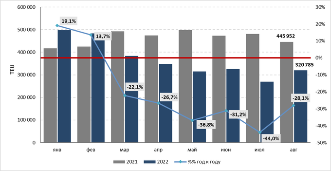 The decline in the container trade seems to have stabilized at -28% y/o/y in August, with ports in the Far East picking some of the volume of the Baltic ones.